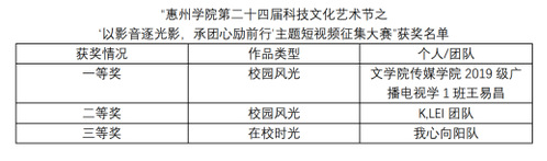 第二十四届科技文化艺术节之“以影音逐光影 承团心励前行”主题短视频征集大赛已于2022年5月圆满结束。经阆苑青年传媒中心初审,网络投票等环节,拟确定“惠州学院第二十四届科技文化艺术节之“以影音逐光影,承团心励前行”主题短视频征集大赛一等奖一名,二等奖一名,三等奖一名。