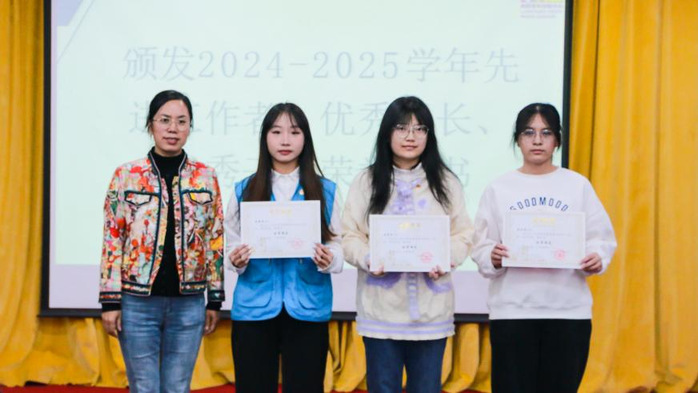 会议在全体参会人员齐唱国歌中拉开序幕。杜建聪老师宣读2024-2025年先进工作者、优秀组长、优秀干事名单并由田翠华书记颁发荣誉证书。